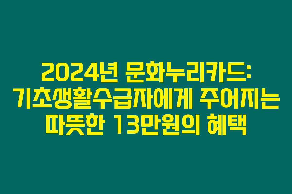 제가 직접 알아본 바로는 2024년 문화누리카드는 기초생활수급자와 차상위 계층에게 연간 13만원의 혜택을 제공하고 있습니다. 이하를 읽어보시면 그보다 더 많은 정보와 활용 방법을 알게 되실 거예요.