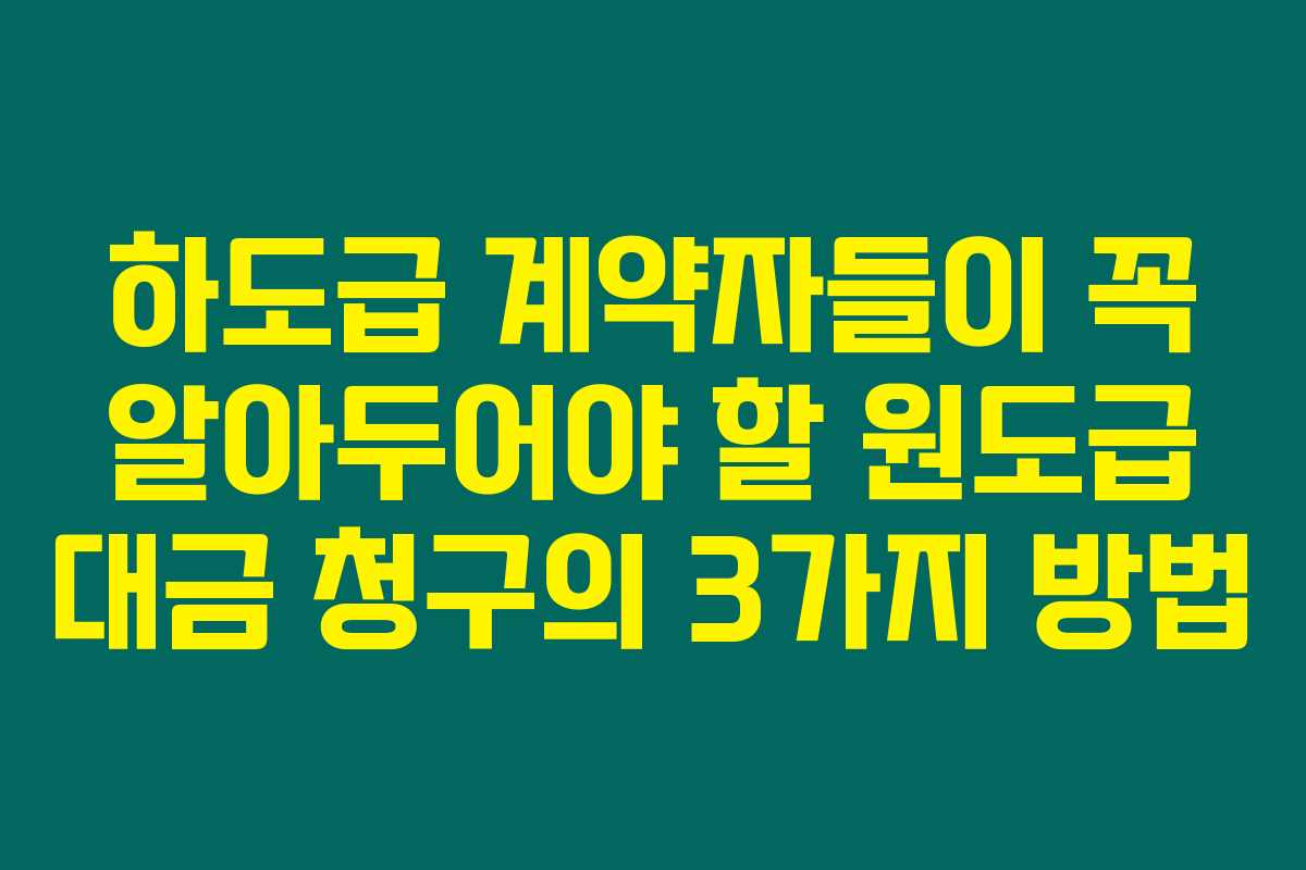 하도급 계약자라면 원도급 대금 청구는 언제나 중요한 이슈이지요. 많은 분들이 어려움을 겪기도 하고, 방법을 몰라서 고민하는 경우가 많습니다. 아래를 읽어보시면 하도급지킴이를 통해 원도급 대금을 청구하는 3가지 방법을 알 수 있을 뿐만 아니라, 각 방법의 장단점도 확인할 수 있습니다.