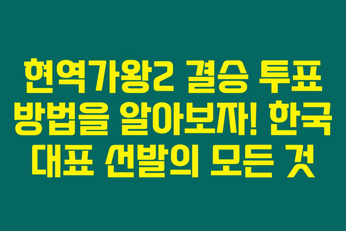 2025 한일가왕전 대표 선발 결승전이 다가오고 있습니다. 만약 여러분이 이 멋진 대회에 대한 정보를 찾고 계신다면 주목하세요. 현역가왕2 결승 투표 방법을 잘 모르는 분들이 많을 거라 생각해요. 그래서 아래를 읽어보시면, 소중한 한 표를 행사하는 방법을 쉽게 이해할 수 있게 정리해드릴게요.🎤🎶