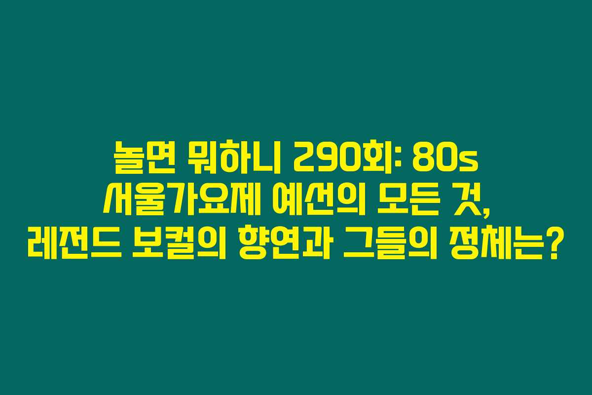 ‘놀면 뭐하니’ 290회에서 열린 80s 서울가요제 예선, 이젠 당신도 그 숨겨진 보컬들의 정체를 확인하실 시간입니다. 과거의 감성을 새롭게 경험하고 싶다면 이 글을 통해 그 특별한 순간을 함께 느껴보세요.